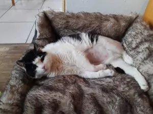 Ich weiß nicht wie alt ich bin – sicher schon über 15. Ich darf seit 2019 gemütlich meinen Lebensabend bei Jasmine verbringen. Inzwischen lasse ich mich sogar spritzen. Ich hasse es zwar, aber es tut schon gut. Und außerdem gibt es danach was zu fressen, und das ist nun mal meine absolute Lieblingsbeschäftigung. Ich bleibe am liebsten in der Wohnung oder schaue höchstens mal ins Treppenhaus. Die Knochen sind halt nicht mehr das was sie mal waren. Meine Meinung kann ich aber immer noch sehr lautstark äußern, wenn mir mal was nicht passt.